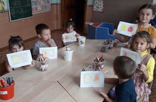 Продолжать учить детей аккуратно пользоваться красками, намазывать его кисточкой, не выходя за контур фигуры, плотно прижимать изображение салфеткой. Развивать мелкую моторику рук.Формировать навыки аккуратной работы. Вызвать у детей радость от полученного изображения.