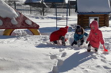 Каждый день мы любим гулять и играть на улице, а сегодня особо солнечно и тепло, поэтому кто-то играет в снежки, а кто-то копает лабиринты и дорожки.
