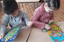 Сегодня дети учились пришивать игрушки со шнуровками на нужное им место.