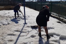 На территории детского сада сотрудники раскидали снег.