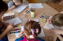 На занятии рисования воспитанники 2 младшей группы в своих рисунках изобразили зелёную ёлку и сугробы белого снега, границы которых нарисовала воспитатель.