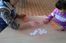 На занятии математики воспитанница подготовительной группы повторила счёт цифр от 0 до 10 в виде игры домино с воспитателем.