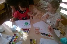 На занятии рисования малыши усердно и с интересом разукрашивали свои маленькие ладошки и с воспитателем отпечатывали их на альбом.