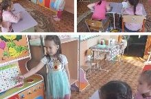 Режим моментларда балалар белән берлектә төрле уеннар оештырыла, шуларның берсе Мәктәп. Уен барышында балалар үзләренең үскәч кем булуларын күрсәтә, мәктәпнең нинди икәнлеген күз алдына китерәләр һәм бик теләп үзләрен укытучы дип хис итәләр./ В режимных моментах вместе с детьми организуются различные игры, одна из которых школьная. В ходе игры дети показывают, кем они будут, когда станут взрослыми, представляют школу, себя в роли учеников и с удовольствием чувствуют себя учителями.