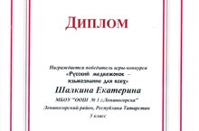 Школа №1 поздравляет ученицу 3-го класса, Шалкину Екатерину Юрьевну - победителя игры-конкурса "Русский медвежонок - языкознание для всех" и желает ей успехов в учёбе и дальнейших творческих побед 20.03.2015