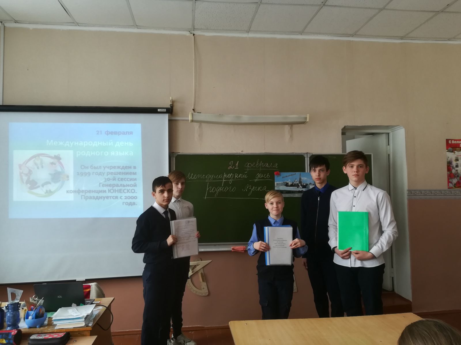 6 февраля, в 8 классе, классным руководителем Иксановой Е.Г. был проведен классный час, посвященный 21 февраля - Международному дню родного языка. Учащиеся 8 класса познакомились с историей возникновения праздника и узнали, что язык – это не только инструмент для общения между разными людьми, но и память, характер, культура и традиции народа. Классный час сопровождался различными заданиями, играми, конкурсами. Мероприятие сопровождалось, презентацией, подготовленной учащимися данного класса. Завершили праздник исполнением песни «Как здорово, что все мы здесь сегодня собрались».6 февраль көнне 8 сыйныф укучылары белән сыйныф житәкчесе Иксанова Е.Г. 21 февраль - Туган тел көненә багышланган чара үткәрделәр. Укучылар бәйрәмнең килеп чыгу тарихы белән таныштылар, тел-ул төрле кешеләр арасында аралашу коралы гына түгел, туган телнең халык характеры, аның хәтере, тарихы, рухи көче булганын белделәр. Чарада төрле биремнәр,уеннар,конкурслар уздырылды. Чара укучылар әзерләгән презентация белән үрелеп барды. Бәйрәм «Бик шәп,без барыбыз да буген монда җыелдык» җыры белән тәмамланды.