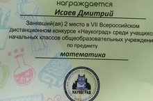 Конкурс «Наукоград» — Всероссийский дистанционный конкурс по учебным дисциплинам. Целями и задачами Конкурса являются:- развитие интереса у участников к учебным дисциплинам;- содействие активизации внеклассной и внешкольной работы по учебным дисциплинам;- предоставление учащимся возможности соревноваться в масштабе, выходящем за рамки региона, не выезжая из него.Конкурс проводился в бланочной форме и состоял из 20 тестовых заданий с выбором одного или нескольких вариантов ответов. Ребята 1-4 классов нашей школы приняли участие в этом конкурсе.Дипломом 3 степени по русскому языку награждена ученица 3 класса Албузова В., дипломом 2степени по математике – ученик 1 класса Исаев Д. Благодарственным письмом оргкомитет Всероссийского дистанционного конкурса «Наукоград» наградил учителей начальных классов Сивачеву Н.В. и Князькину Т.И. за подготовку участников и помощь в организации конкурса. -