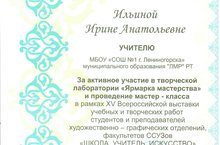 Поздравляем Ильину Ирину Анатольевну, учителя ИЗО, с успешным выступлением в творческой лаборатории «Ярмарка мастерства» и проведении мастер-класса в рамках XV Всероссийской выставки учебных и творческих работ!