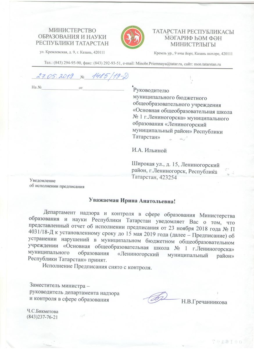 Предписание об устранении нарушений в МБОУ "ООШ №1"