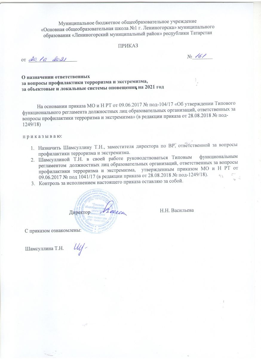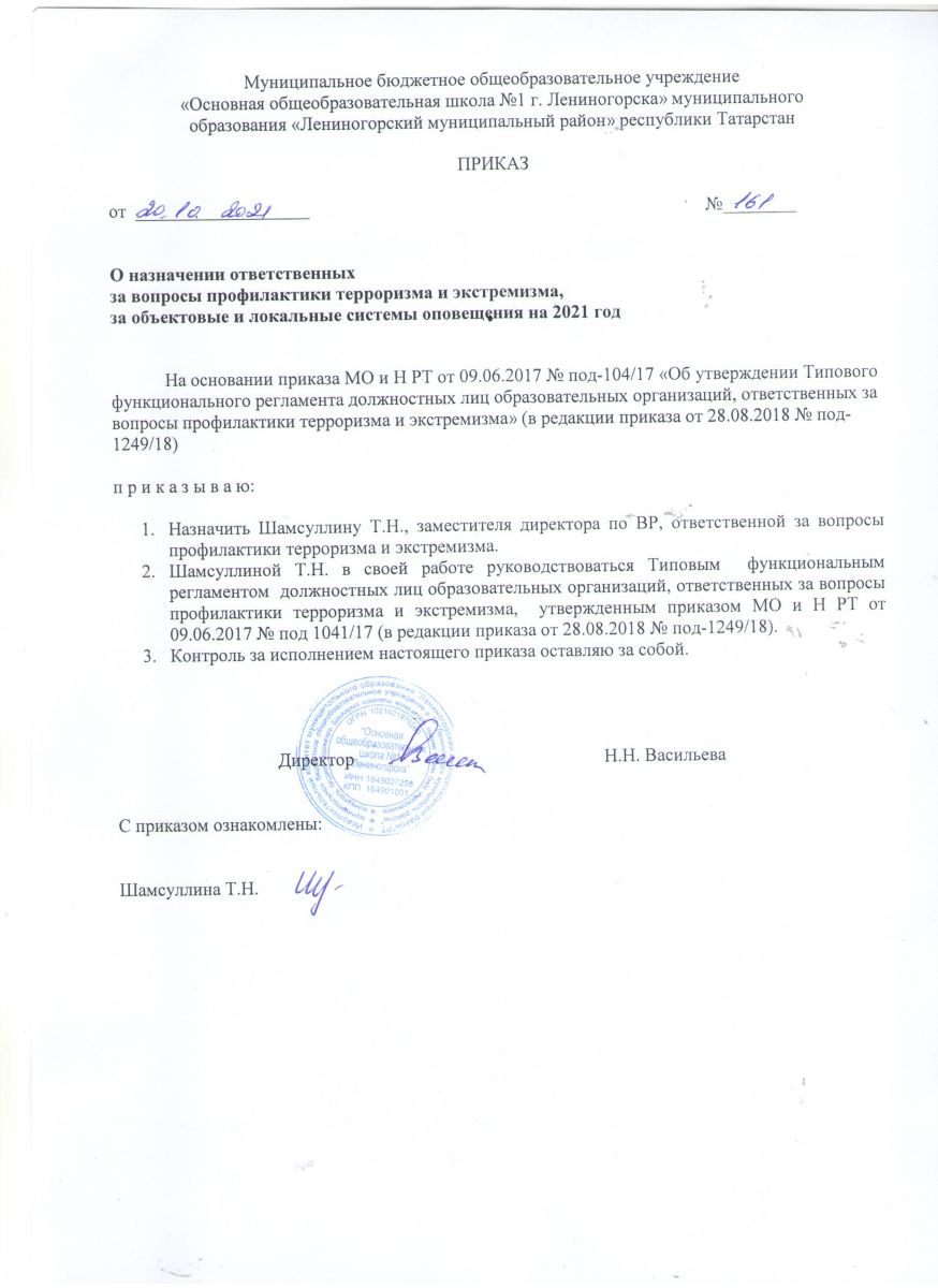 Приказ "О назначении ответственного за вопросы профилактики терроризма и экстремизма"