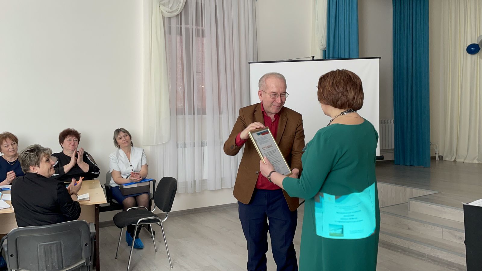 Руководитель стажировки Смирнов Иван Андреевич, доцент кафедры педагогики и управления образованием ИРО РТ вручил директору школы №1 Васильевой Нине Николаевне сертификат стажировочной площадки, участвующей в реализации программы дополнительного образования повышения квалификации "Школа руководителей: эффективные практики управления".