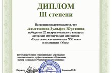 Поздравляем учителя татарского языка и литературы, Зульфию Юратовну Ахметзянову, победителя III межрегионального конкурса авторских методических материалов «Педагогические инновации XXI века» в номинации «Урок»