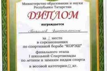 Миронова Вячеслава, ученика 7Б класса, занявшего II место в соревнованиях по спортивной борьбе «КОРЕШ» финального этапа I школьной Спартакиады по летним и зимним видам спорта в весовой категории 43 кг.