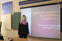 Сегодня в рамках "Недели химии" среди учащихся 11-го класса прошёл конкурс презентаций по теме "Татарстан - территория большой химии". Были представлены следующие работы: "Великие химики Республики Татарстан", "Казань - колыбель российской органической химии", "Именные химические реакции", "Химики - лауреаты Нобелевской премии". Все работы были разнообразны и интересны. По итогам конкурса лучшие презентации будут отчены грамотой.