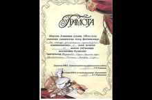 Абдулла Алишның тууына 105 ел тулу уңаеннан уздырылган театр фестивалендә “Иң матур декорация кулланучы” номинациясендә III урын яулаган 10 нчы мәктәп укучылары коллективы бүләкләнә
