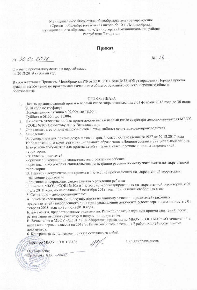 Приказ о начале приема документов в 1 класс на 2018-2019 учебный год