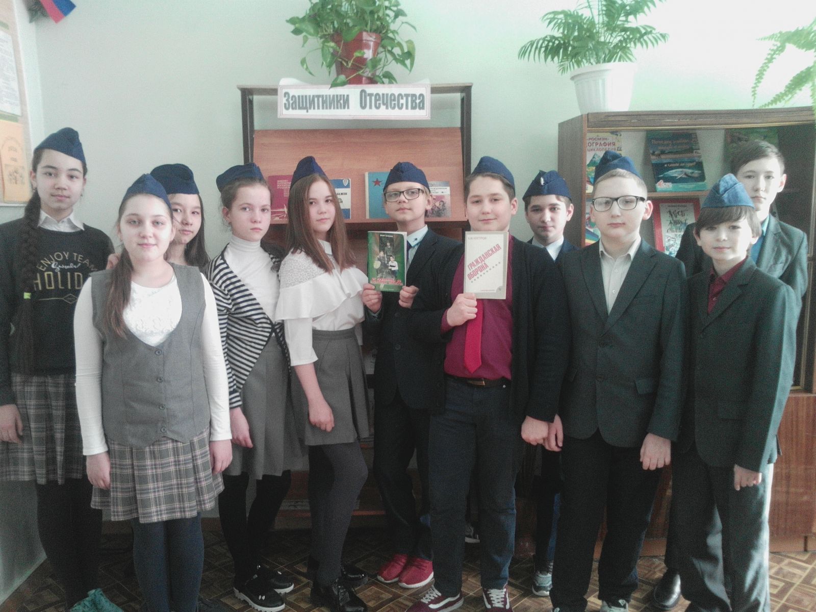 В феврале месяце 2018 года по патриотическому воспитанию школьная библиотека провела с читателями 4-9 классов следующие мероприятия: книжные выставки «Жизнь как песня», посвященная творчеству М. Джалиля; «Защитники Отечества»; «Это должен знать каждый»