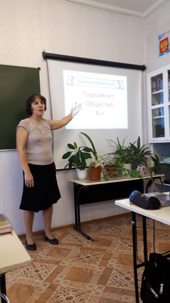 Тема парламентского урока 2018 года: «Парламент, общество и я». В 9Б классе 16 октября прошел парламентский урок в виде диспута. Ребята выслушали сообщение о Гос Совете РТ, о его задачах и целях. Затем разговор плавно перешел на тему о гражданском обществе. Подводя итоги урока, девятиклассники делились мыслями о том, что лично каждый из них мог бы сделать как член общества для его оздоровления. Цели урока были достигнуты.