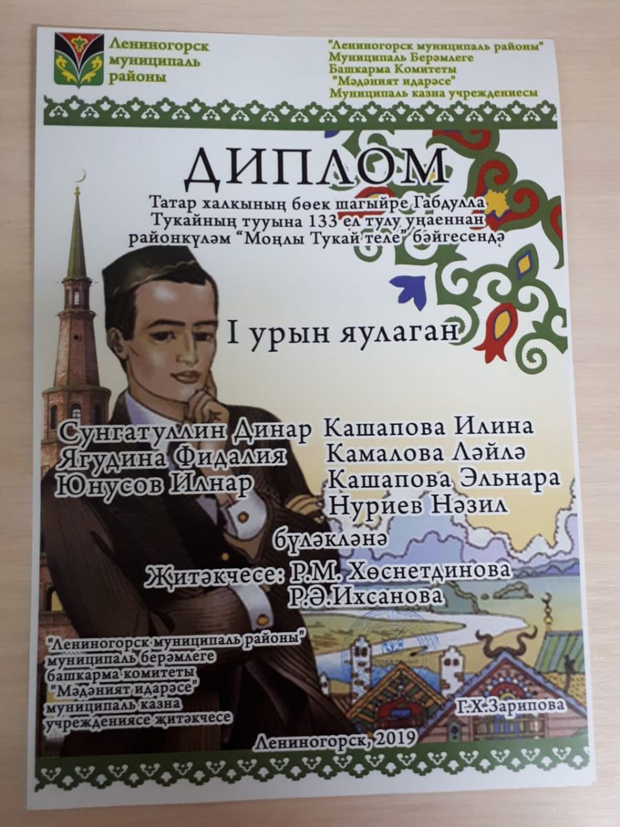 26 нчы апрель – Г.Тукайның туган көнендә- театр бәйгесендә катнашучы укучылар районкүләм оештырылган Г.Тукайга багышланган шигырь кичәсендә катнаштылар. Алар анда «Лениногорск муниципаль район» муниципаль берәмлеге башкарма комитеты “Мәдәният идарәсе” муниципаль казна учреждениесе җитәкчесе Г.Х.Зарипова кулыннан 1нче урын диплом белән бүләкләнделәр.