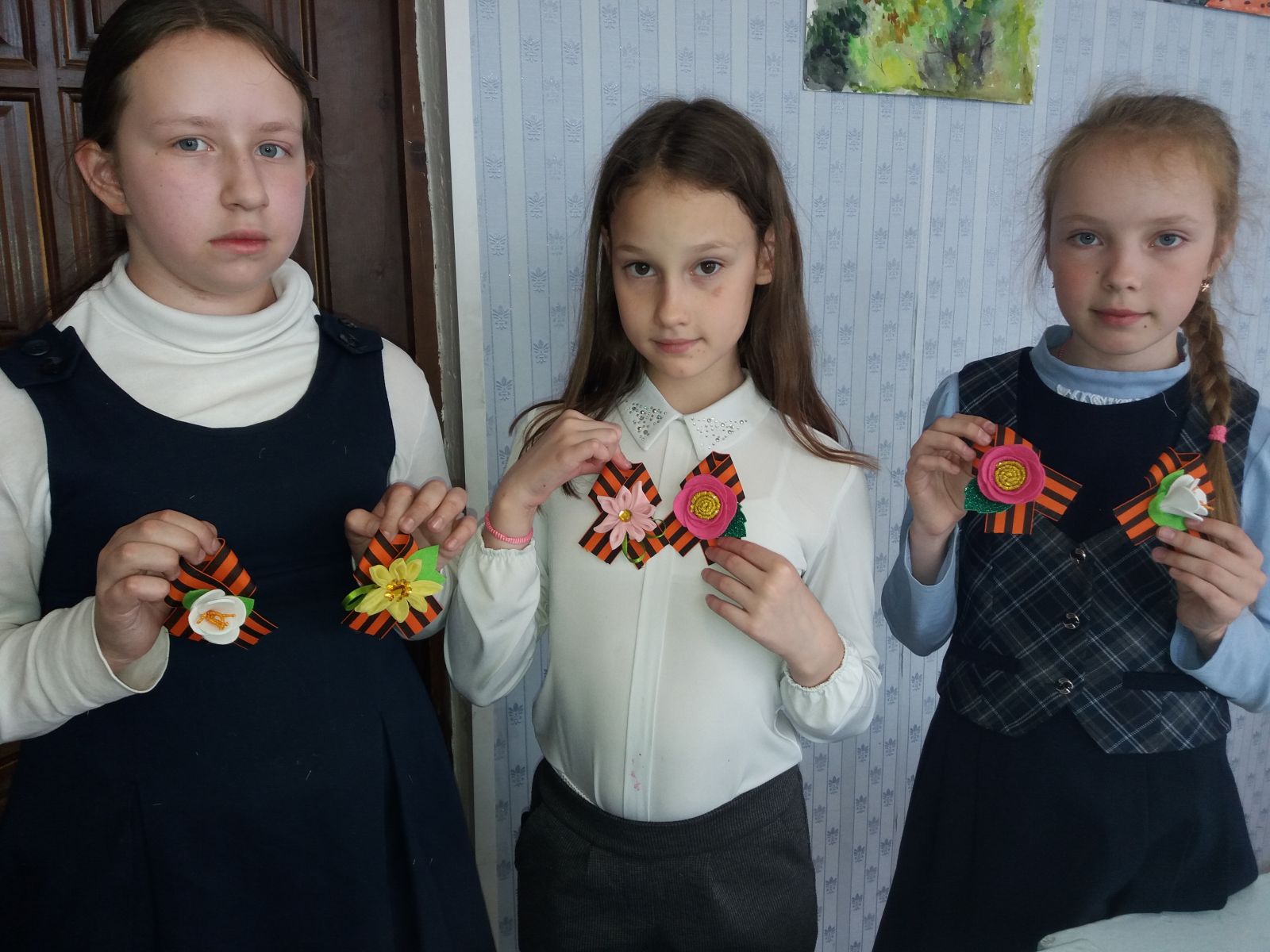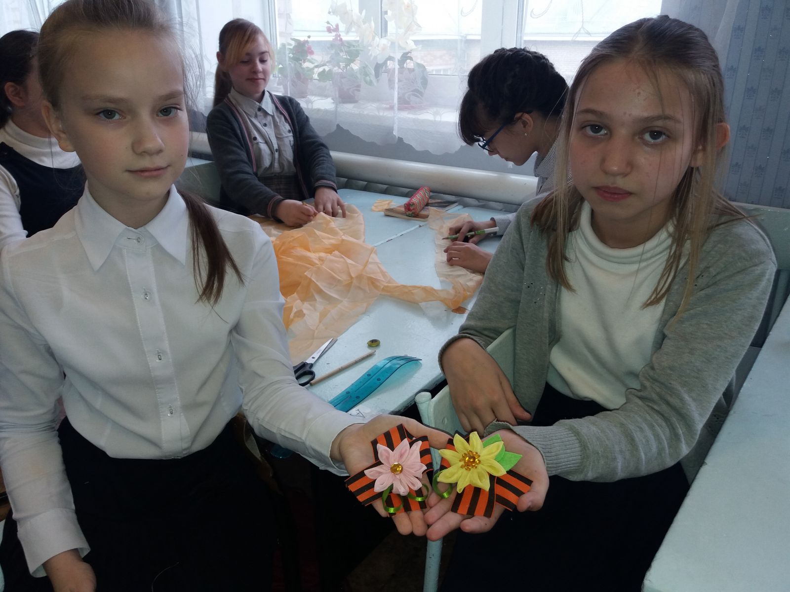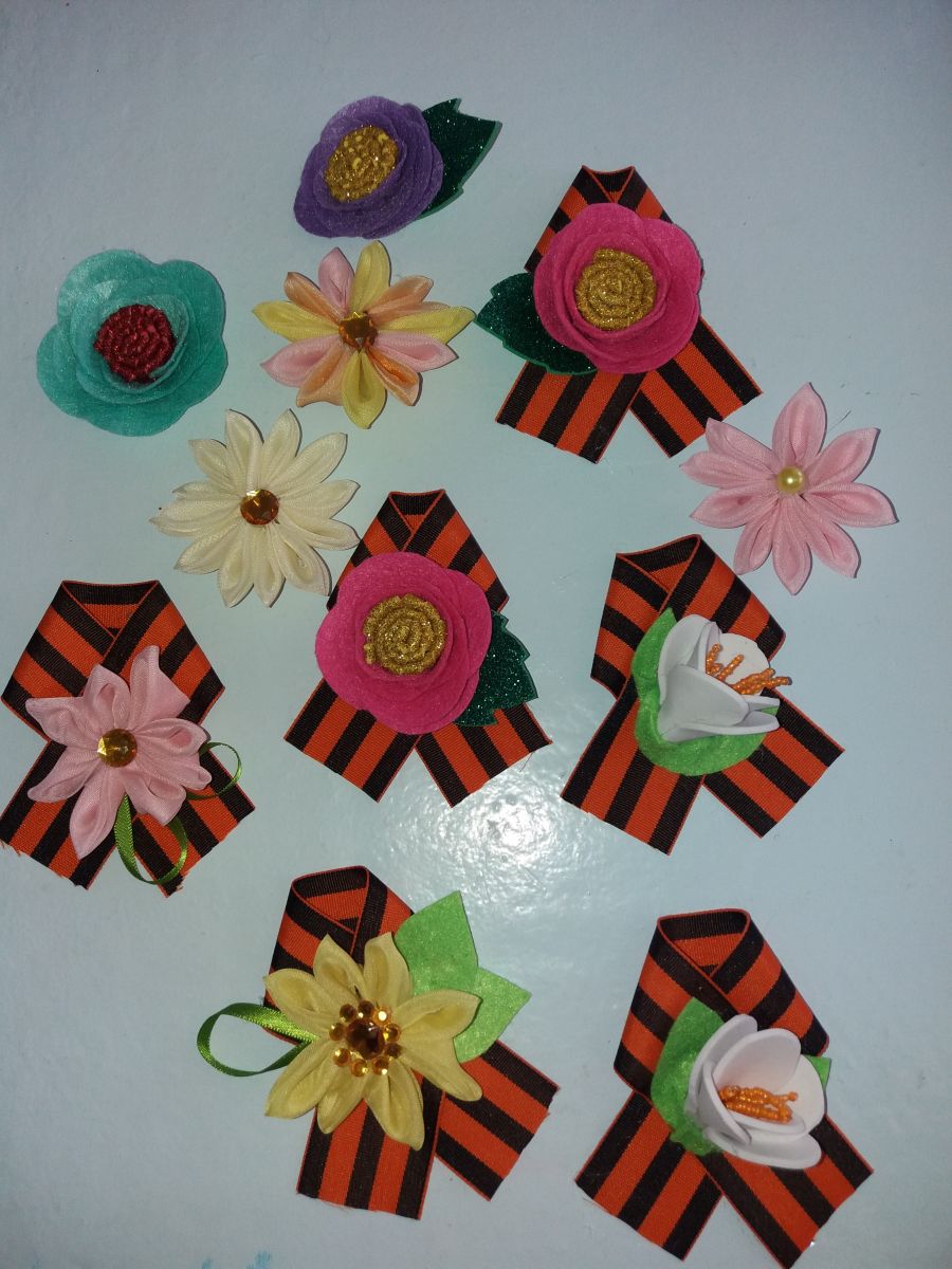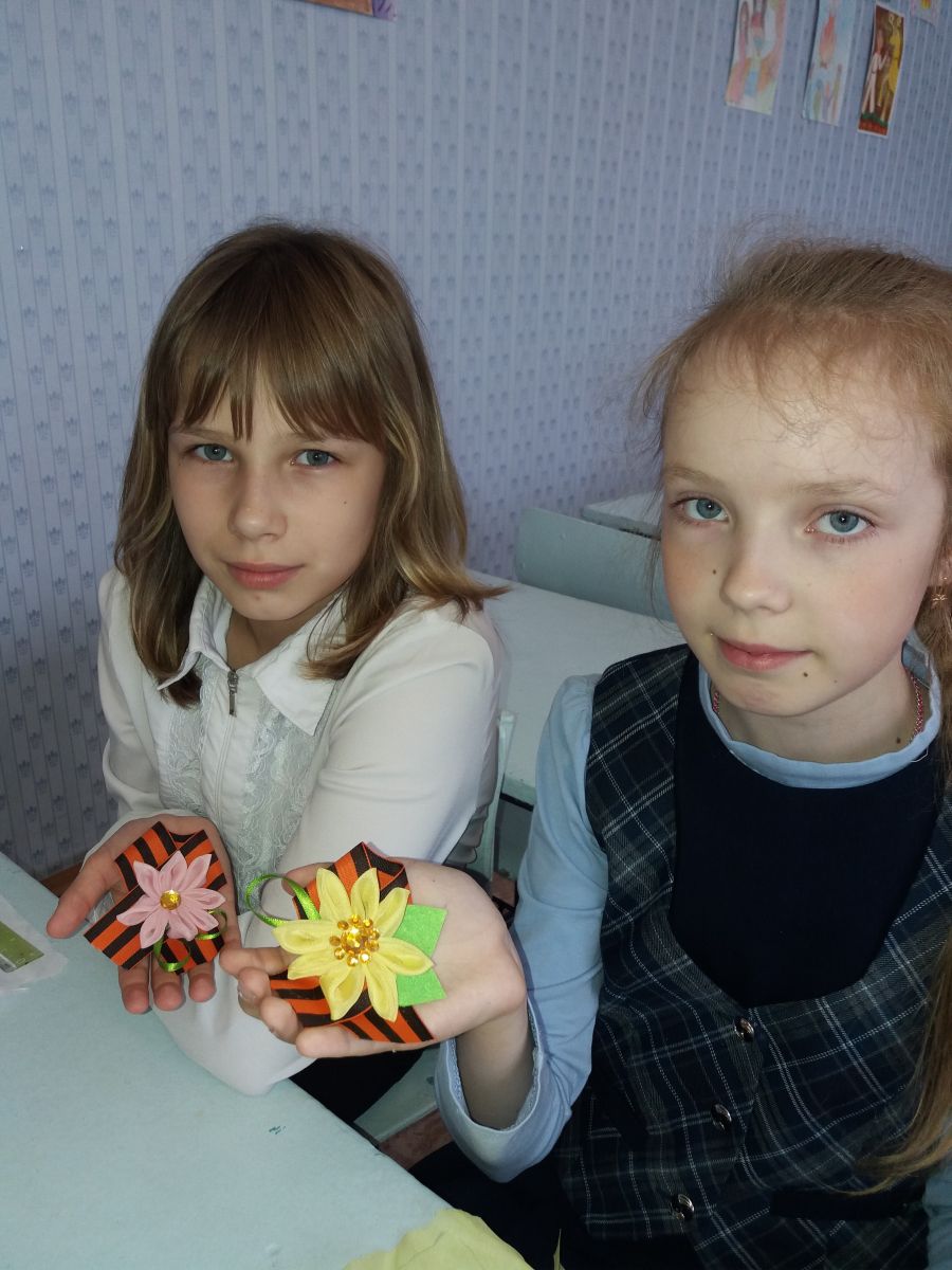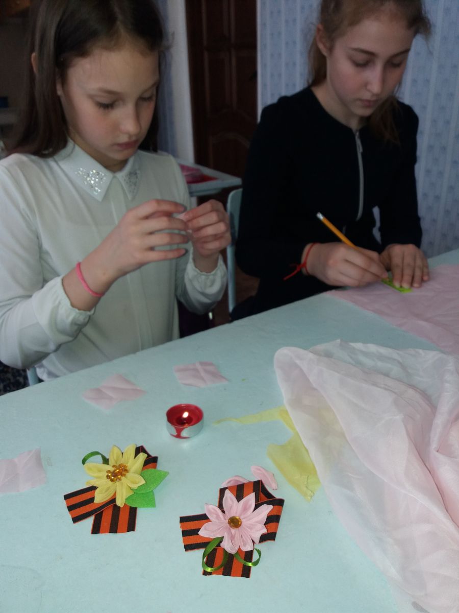 Ребята с удовольствием своими руками изготовили георгиевские ленточки, украсив их декоративными цветами.