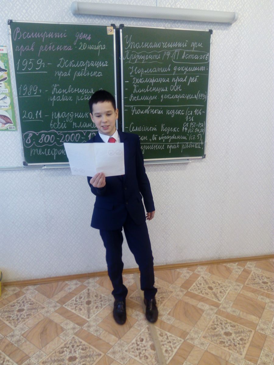 13 ноября в 5 в классе (классный руководитель Димиева Э.А.) был проведен День правовых знаний. Целью данного занятия было ознакомление детей с их правами, закрепленными в Конвенции о правах ребенка, Конституции РФ, соотнесение прав и обязанностей детей.