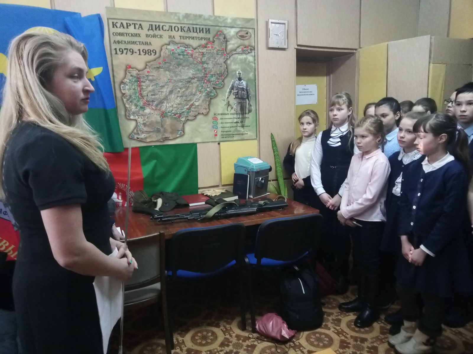 В этот день учащиеся 5в класса (руководитель Димиева Э.А.) посетили Музей Боевой славы ветеранов войны в Афганистане, создателем и руководителем которого является Даутов Рамиль Таминдарович.