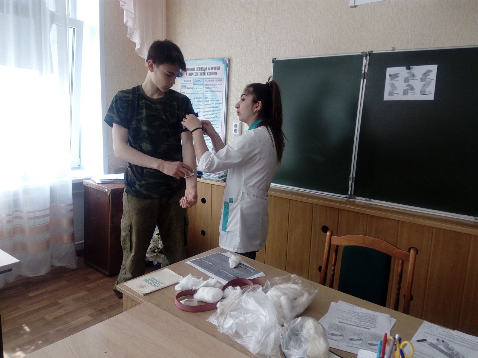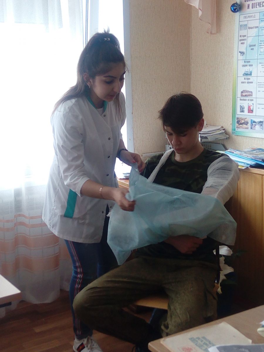 Учащиеся 11 класса вместе с преподавателем – организатором ОБЖ Димиевой Э.А. провели занятие «Оказание первой медицинской помощи при различных видах повреждений».