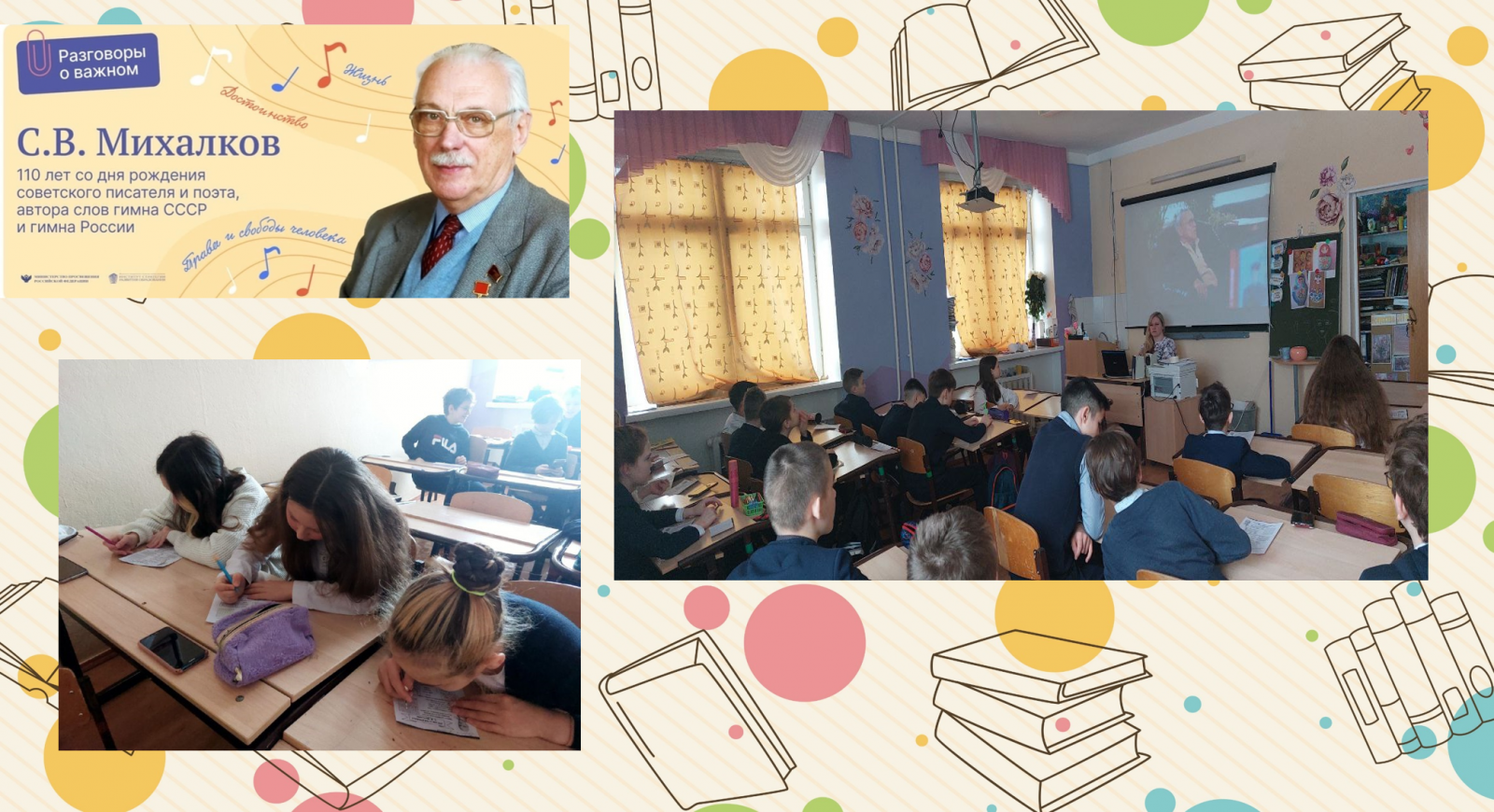 На внеурочных занятиях "Разговоры о важном" говорили на тему «110 ЛЕТ СО ДНЯ РОЖДЕНИЯ СОВЕТСКОГО ПИСАТЕЛЯ И ПОЭТА, АВТОРА СЛОВ ГИМНА СССР И ГИМНА РОССИИ С. В. МИХАЛКОВА».