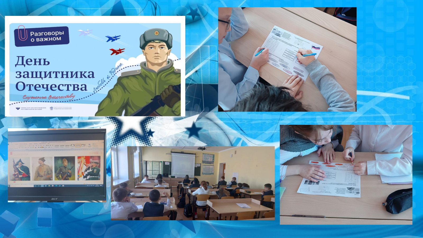 В рамках курса внеурочных занятий "Разговоры о важном" прошел классный час по теме "День защитника Отечества". Цель занятия: сформировать у обучающихся понимание роли Вооруженных сил Российской Федерации в обеспечении безопасности государства и его граждан на протяжении всей истории страны, воспитать благодарность к тем, кто защищает право народов России жить согласно историческим традициям и многовековым духовно-нравственным ценностям. Ребята посмотрели видеоролик и обсудили значение таких понятий как патриотизм, любовь к Родине, служение Отечеству.