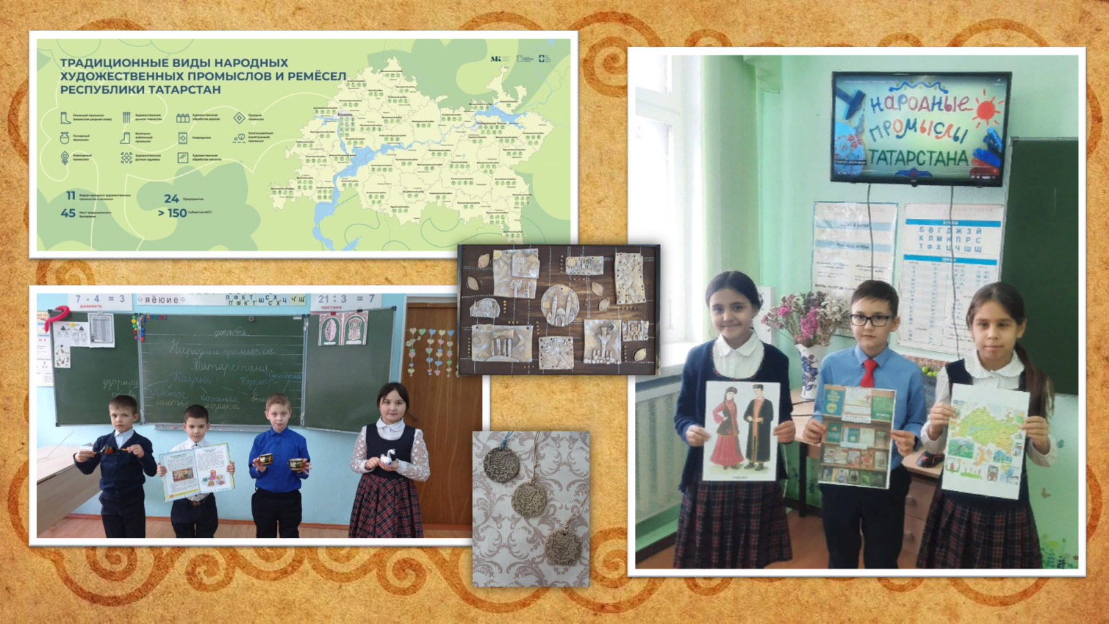 В ходе классного часа ребята узнали о богатой истории народных промыслов Татарстана, о различных ремеслах, которые являются важной частью культуры республики. От плетения корзин и ковров до росписей по дереву и создания национальных кукол – ученики познакомились с творчеством татарского народа.