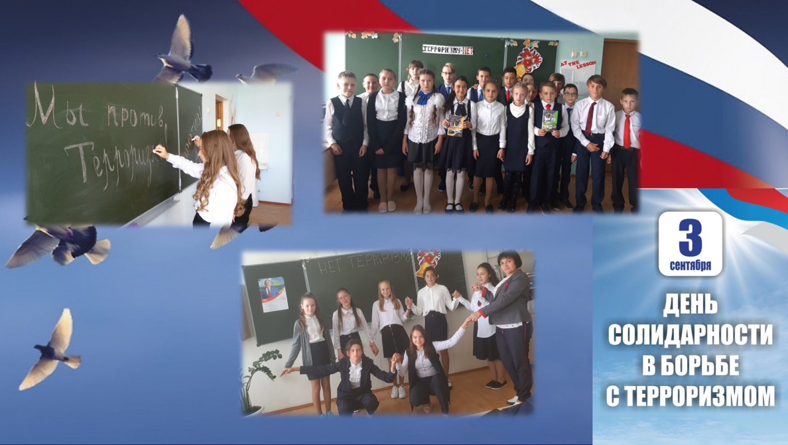 Внашей школе прошли мероприятия, посвященные Дню солидарности в борьбе с терроризмом. Ежегодно 3 сентября в России отмечается особая дата - День солидарности в борьбе с терроризмом. Эта дата неразрывно связана с трагическими событиями, произошедшими в г. Беслан с 1 по 3 сентября 2004 года. В этот день россияне с горечью вспоминают людей, погибших от рук террористов.