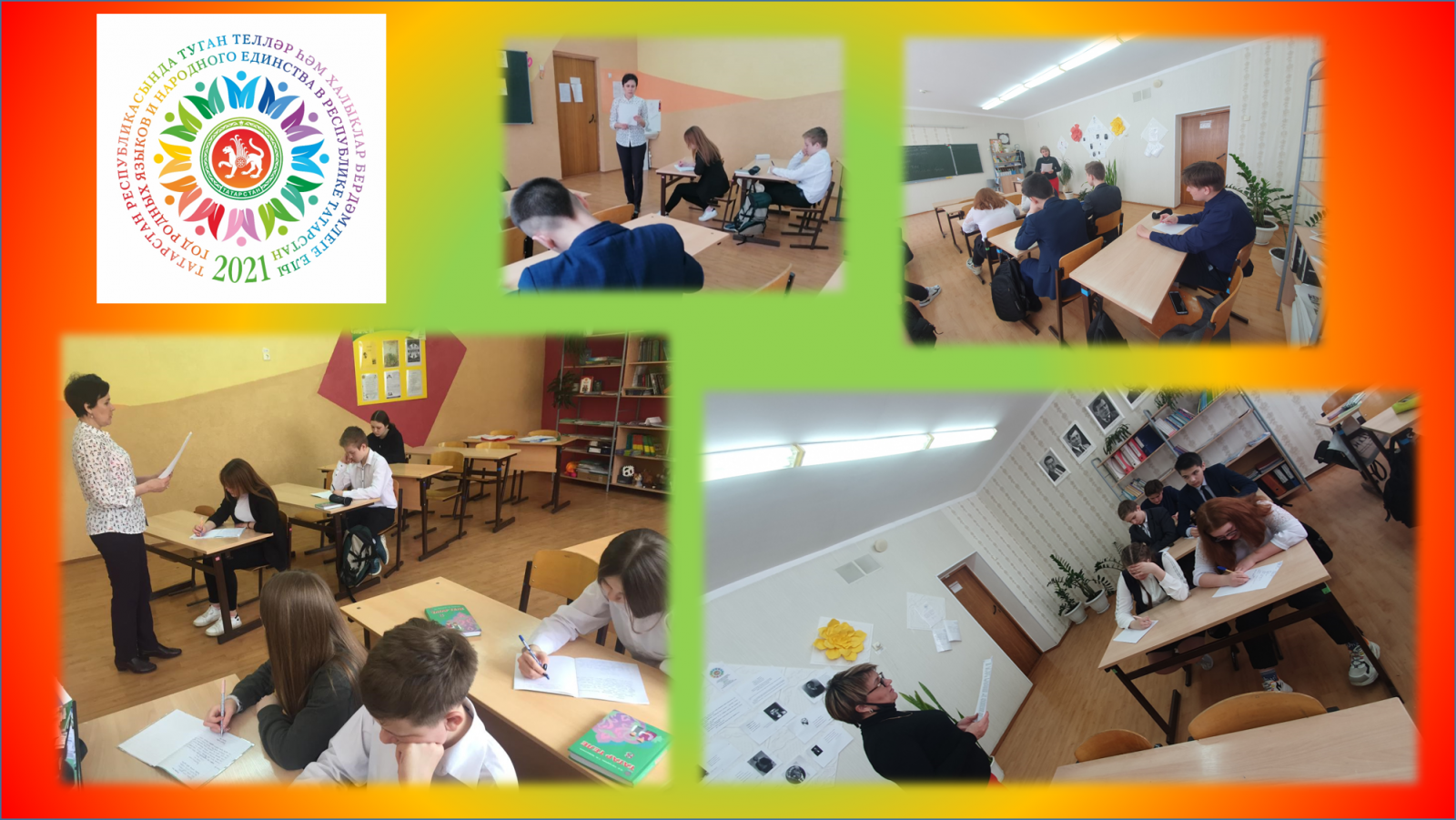 Туган телләр һәм халыклар бердәмлеге елы кысаларында ТИСБИ университеты “Туган тел-Ватан нигезе” исеме астында 5 апрельдән 10 апарельгә кадәр белем бирү акциясе үткәрә. 8-11 нче сыйныф укучылары татар телендә диктант язалар. Бүген 7 апрельдә мәктәптә 8 һәм 9 нчы сыйныфлардан 10 укучы диктант язуда катнашты. Әлеге чара татар телендә дөрес язуга кызыксынуны арттыруга, әдәби татар телен кулланучылар даирәсен арттыруга юнәлдерелгән.