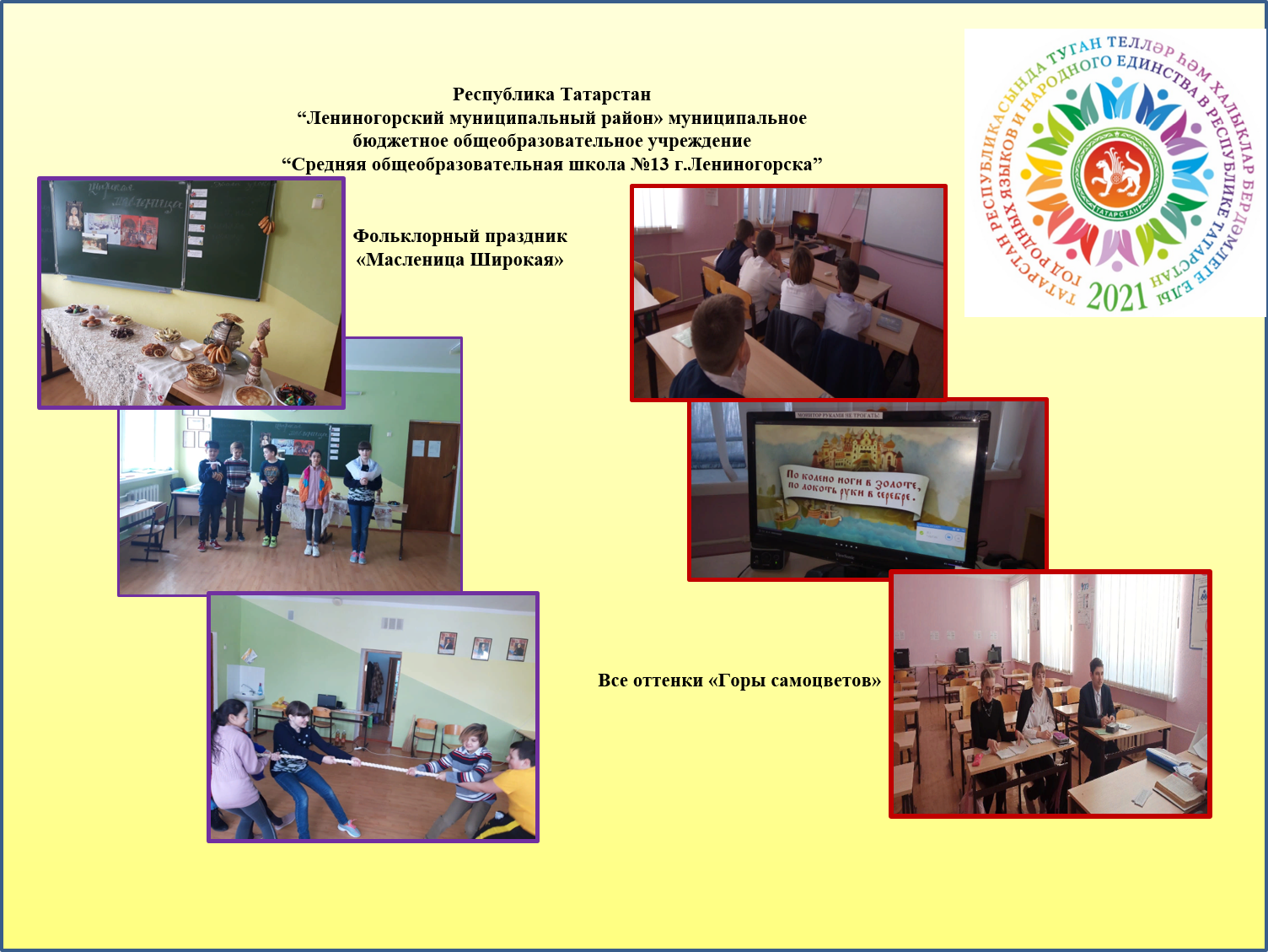 МБОУ «СОШ № 13» 16 марта в 4 классе был проведен урок по теме «Моя Семья», посвященной Году родного языка и народного единства. На уроке ребята с большим интересом рассказывали на 3х языках на татарском, на английском и на русском языке о членах семьи. Ребята провели большую исследовательскую работу по теме «Моя Семья», брали интервью у членов семьи, делали проекты, рисовали портреты своей семьи. Рассказывали, что значит для них родной язык. Также на уроке были исполнены песни на татарском, на английском и на русских языках.