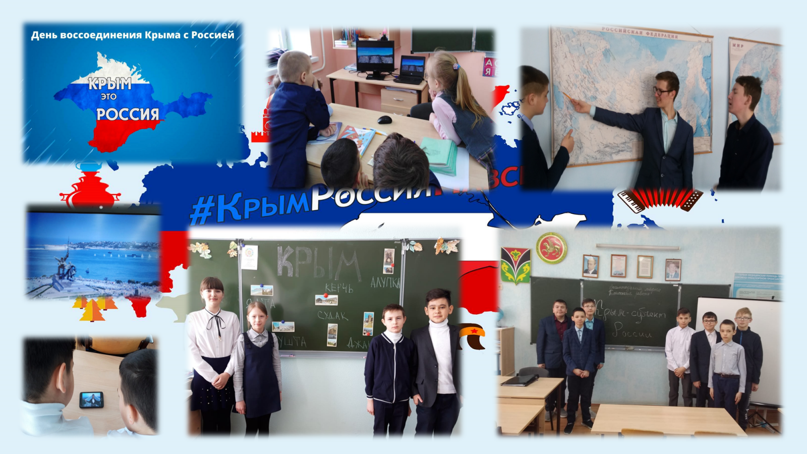 В связи с исторической датой присоединения Крыма к России с 12 по 19 марта 2021 г. в школе были проведены внеклассные тематические мероприятия с целью воспитания у учащихся патриотизма, уважения к истории своей страны, народов, проживающих на территории Крыма. Ребята подробно познакомились с историей Крыма, им были продемонстрированы слайды роль Крыма в отечественном искусстве и культуре.