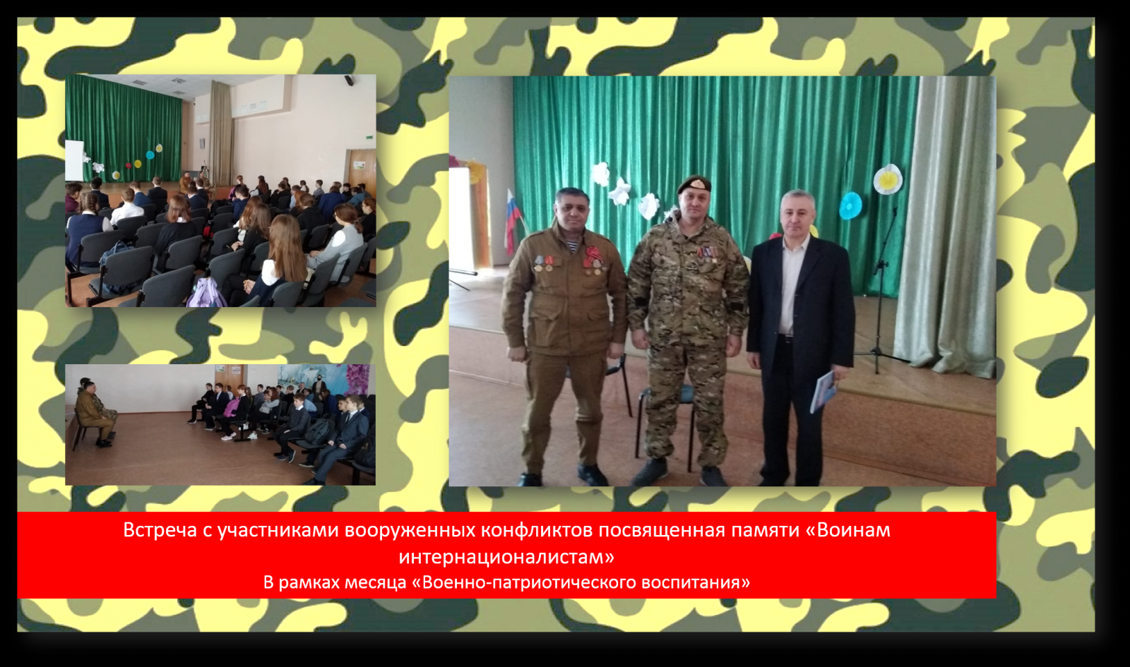 Встреча с участниками вооруженных конфликтов посвященная памяти «Воинам интернационалистам». Нашу школу посетили замечательные люди Мурадов Рустам Шодманович и Атакишиев Камаладдин Анвер Оглы. Они являются участниками тех событий. Рассказали ребятам о так сложно было в то время, как воевали, как защищали Родину ценой своей жизни. Почтили память погибших минутой молчания. Немало воды утекло с того времени. Потихоньку зажили раны, возмужали и стали мудрее солдаты и офицеры. Но память о далекой Афганской войне жива и стереть события той войны не смогут ни годы, ни расстояния. Многие с той войны вернулись окрепшими, возмужавшими, их грудь украсили ордена и медали. Награды за мужество, отвагу и честь. А кому-то не суждено было вернуться к родному порогу, полегли они на каменистой афганской земле. Но память о многих мальчишках, не вернувшихся с той войны, память о тех, кто ушел из жизни в мирное время будет вечной.