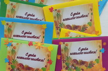 Поздравительные открытки были сделаны учащимися 8 и 7 класса под руководством учителя искусства Сергеевой А.В. Обучающимся сделаны лаконичные и корректные фразы, которые разместились на «облаках» и использовались классами.