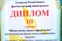 19 нчы февраль көнне Сарман районы Җәлил бистәсенең 2 нче урта гомуми белем мәктәбендә “Шушы яктан, шушы туфрактан без” республикакүләм фәнни-гамәли конференциянең финалы булды. Анда Сарман районы академигы, шагыйрь Дамир Гарифуллин, галимнәр, район һәм бистә җитәкчеләре, язучылар, республикабызның төрле районнарыннан финалга үткән укучылар, укытучылар катнашты. Фәнни-әдәби бәйгенең 8 юнәлештә җиңүчеләре билгеләнде. 9б классы укучысы Григорьев Даниил 3нче дәрәҗә дипломга лаек булды. Котлыйбыз!!!