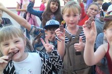 Затем, немного поиграв на свежем воздухе и плотно пообедав, отряды приняли участие в конкурсе "Шоколадный праздник". Ребята соревновались на смекалку, отгадывая шоколадные загадки, а так же на быстроту и ловкость. В ходе праздника ребят ждал конкурс "Дегустация", где каждый из участников с закрытыми глазами должен был угадать какой вид шоколада они попробовали. Отряды принимали активное участие, и с интересом наблюдали за ходом конкурса.После "Шоколадного праздника" каждый получил сладкий сюрприз.
