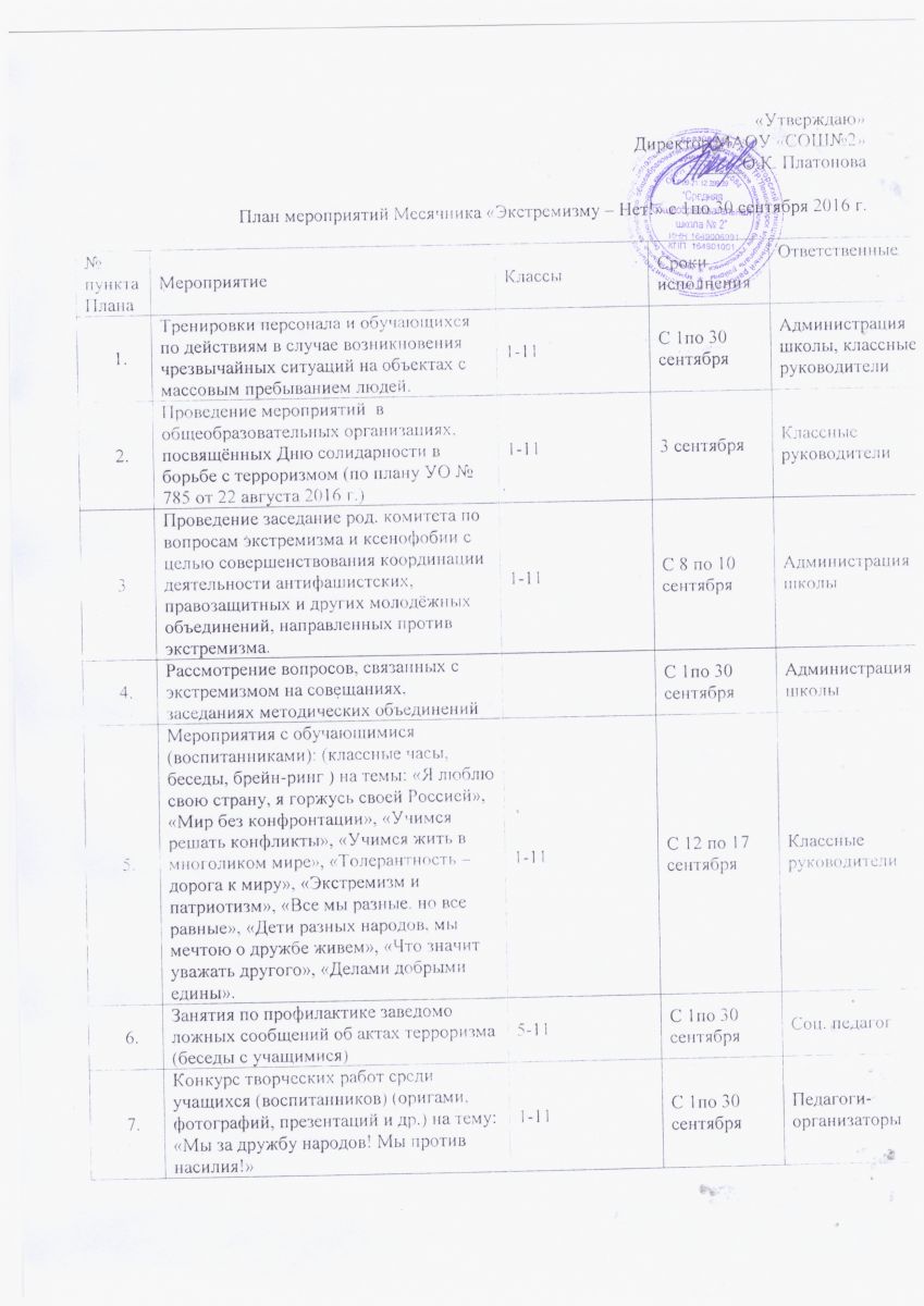 В рамках проведения Дня солидарности в борьбе с терроризмом 3 сентября в школе были проведены классные часы с просмотром документально-тематических видеофильмов. Данные мероприятия были направлены на формирование у детей и подростков идеологии противодействия терроризму, неприятия насилия, экстремизма и межнациональной вражды.
