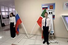 Сегодня право вынести флаги РФ и РТ предоставилось учащимся 7б класса: Латыповой Карине - отличнице учебы, активистке класса и школы, председателю направления «Медиа редакции» Движения Первых и Насырову Амалю - победитель Олимпиады КФУ, победителю научно-практической конференции «Я -исследователь».
