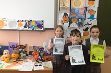 В школе среди учащихся 3-6 классов прошел творческий конкурс поделок. Конкурс не страшный, а веселый и красивый. Из бумаги и картона, из банок и бутылок, из природных материалов или того, что уже хотели выкинуть в мусорную корзинку, были изготовлены самые разные поделки. Какой же Хэллоуин без тыквы? Не забыли и про неё. Все участники были отмечены дипломами.