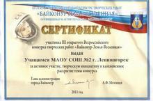 III Открытый Всероссийский конкурс творческих работ «Байконур-Земля-Вселенная», посвященный 50-летию полета в космос Ю.А.Гагарина. 09.04.2012