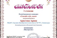 Поздравляем Аристову Арину,ученицу 7 б класса,ставшую победителем республиканского конкурса видеороликов "Спасибо тебе,мама".Молодец,так держать!