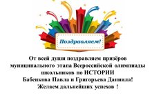 Муниципальный тур олимпиады по истории стал результативным для нашей школы. Учащиеся 11 х классов Бабенков Павел и Григорьев Даниил стали призерами. Поздравляем ребят, а также подготовившего учащихся учителя истории и обществознания Адееву Е.В.