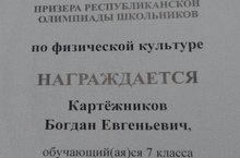 Поздравляем Картежникова Б., учащегося 7 класса, ставшего призером республиканского этапа Всероссийской олимпиады школьников по физической культуре.Молодец! -