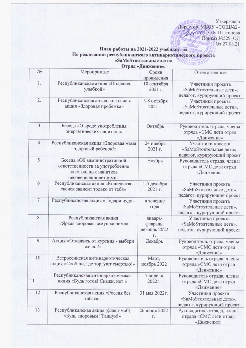 План работы по реализации антинаркотического проекта «SаMоSтоятельные дети» на 2021-2022 учебный год