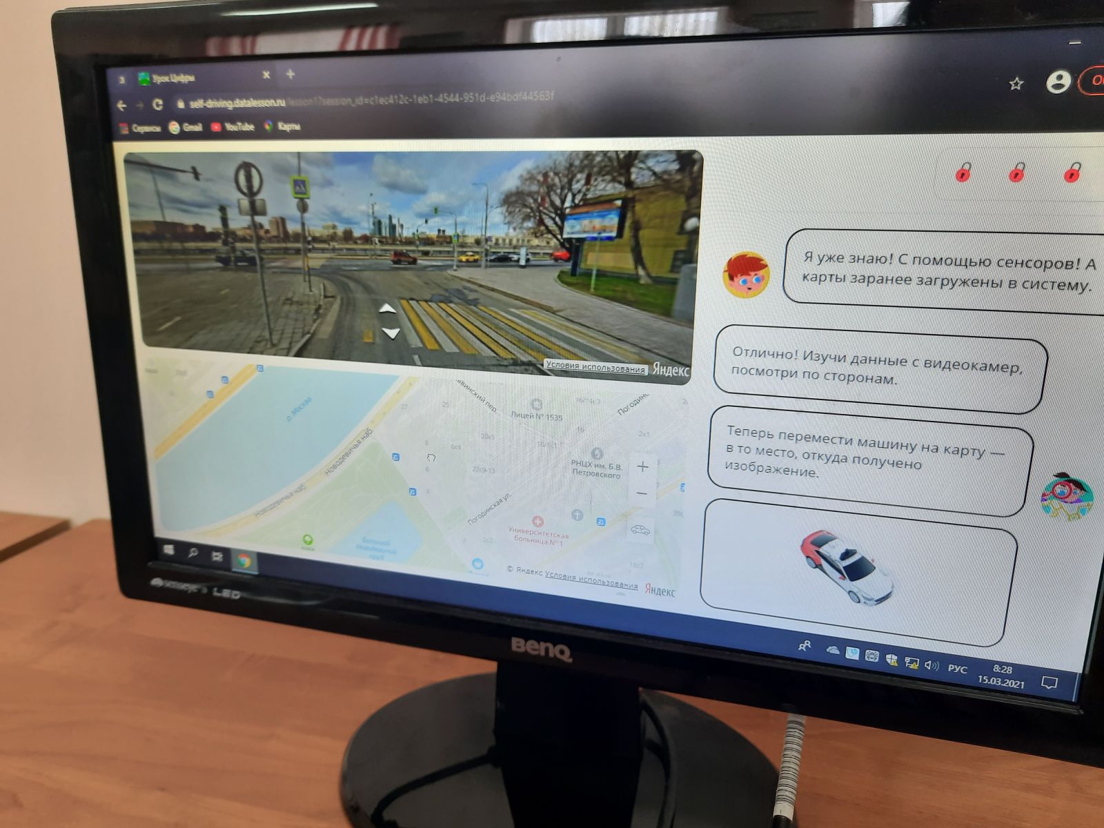 При помощи онлайн-тренажёров ученики могут закрепить полученные знания на практике. Например, в одном из заданий тренажёра школьник сможет почувствовать себя «беспилотным автомобилем», задача которого — добраться из точки «А» в точку «Б», преодолевая разные дорожные ситуации. После прохождения тренажёра ученики (5–11 кл.) могут узнать про профессии, представители которых трудятся над созданием беспилотного транспорта.