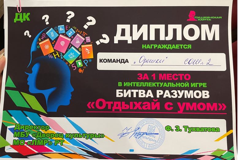 Опубликовано: 17.11.202117ноября во Дворце Культуры состоялась интеллектуальная игра «Битва Разумов». Наша команда «Орешки» заняла 1 место . Поздравляем с победой! Молодцы !
