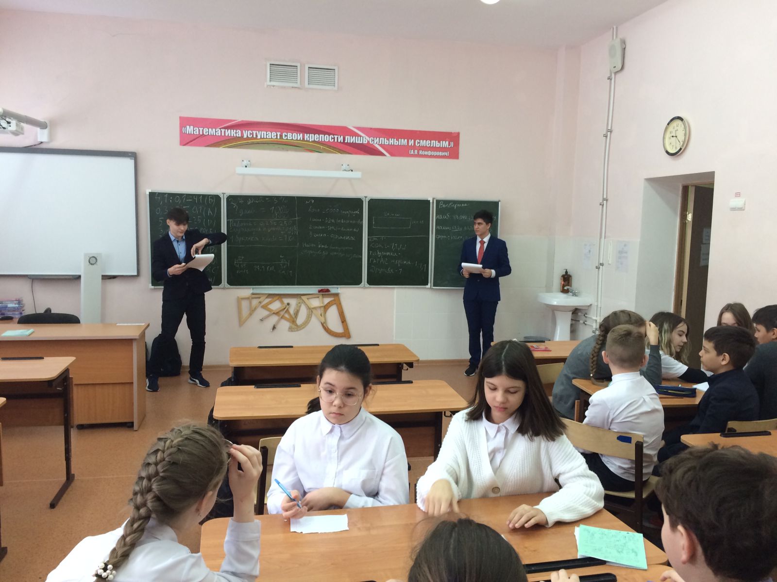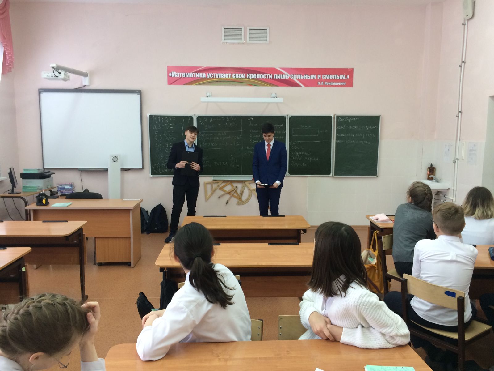 Опубликовано: 21.02.2022Сегодня , 21 февраля, в рамках недели математики, информатики и физики учащиеся 10 класса б Панакшин Андрей и Хайруллин Динар провели мероприятие в 6 а классе , приуроченное к 23 февраля. Были затронуты исторические факты Великой Отечественной войны. Решая задания ребята узнавали много нового : сколько граммов хлеба получали жители блокадного Ленинграда , сколько длилась война, название плана Барбаросса, дальность падения снарядов , скорость танков и тд. Было очень интересно!!