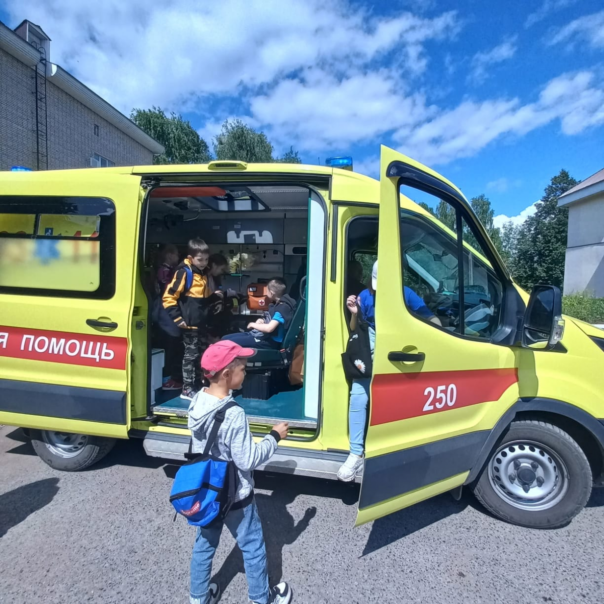 После обеда воспитанники лагеря посетили станцию скорой помощи. Их встретил главный врач Павельев Владимир Георгиевич. Экскурсия началась с ознакомления диспетчерской службой станции .Главный врач рассказал о важности их службы. Ведь они в любое время мчатся на помощь людям. Дети задавали интересующие их вопросы, посидели в каретах скорой помощи. В конце экскурсии дети получили сладкие подарки.